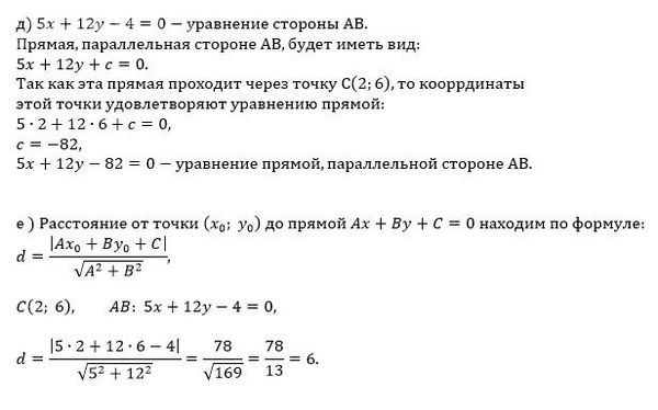 Даны вершины треугольника ABC. Найти: а) уравнение стороны AB; б) уравнение высоты CH; в) уравнение медианы AM; г) точку пересечения медианы AM и высоты CH; д) уравнение прямой, проходящей через вершину C параллельно стороне AB; е) отклонение от точки С до прямой АВ