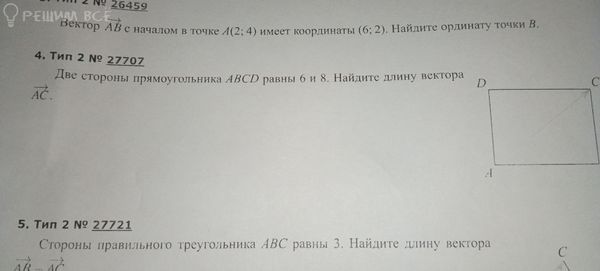 Длина вектора AC — равна длине отрезка AC, который является гипотенузой прямоугольного треугольника ABC с известными катетами. Итак, по т. Пифагора: AC^2 = AB^2 + BC^2 = 8^2 + 6^2 = 64 + 36 = 100; AC = 10.