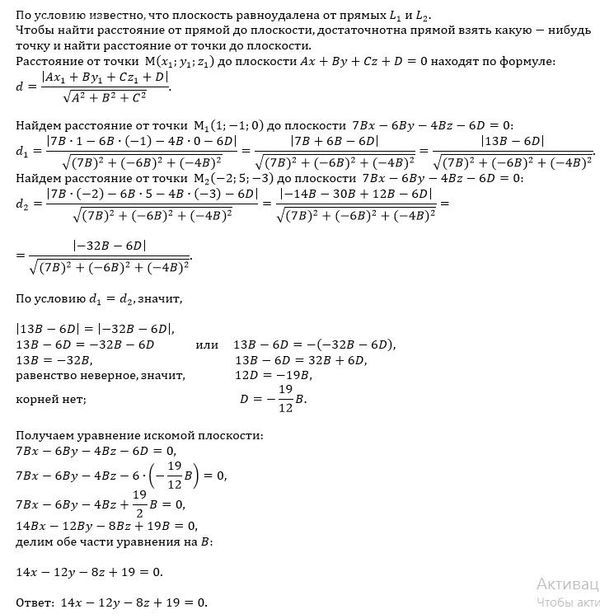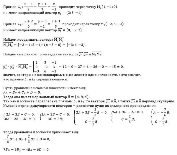 проверить, что прямые L1: (x-1)/2=(y+1)/3=z/-1 и L2: (x+2)/0=(y-5)/-2=(z+3)/3 скрещиваются и найти уравнение плоскости, которая параллельна L1 и L2 и равноудалена от них