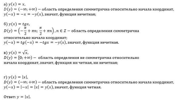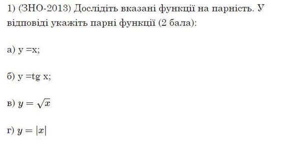Допоможіть, будь ласка. Потрібно на завтра до 13.00 1) (ЗНО-2013) Исследуйте указанные функции на четность. В ответе укажите четные функции (2 балла): a) y =x; 6) y = tg x; в) у = √x г) у = |x|