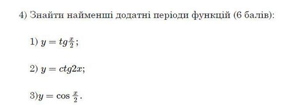 Допоможіть, будь ласка. Потрібно на завтра до 13.00 4) Найти наименьшие положительные периоды функций (6 баллов): 1) у = tg; 2) у = ctg2x; 3)у = соз.