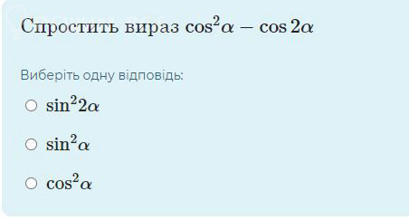 Упростит выражение cos²a 2 cos 2a Выберите один ответ: O sin22a O sin²a O cos² a