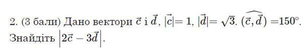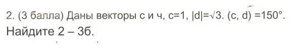 |2[b]c[/b]-3[b]d[/b]|=sqrt((2[b]c[/b]-3[b]d[/b])^(2))=sqrt(4[b]c[/b]^(2)-12[b]cd[/b]+9[b]d[/b]^(2))= =sqrt(4*|[b]c[/b]|^(2)-12*|[b]c[/b]|*|[b]d[/b]|*cos([b]c,d[/b])+9|[b]d[/b]|^(2))= =sqrt(4*1^(2)-12*1*sqrt(3)*cos150^(o)+9*(sqrt(3))^(2))= =sqrt(4-12sqrt(3)*((-sqrt(3))/2)+9*3)=sqrt(4+18+27)=sqrt(49)=7. Ответ: 7.
