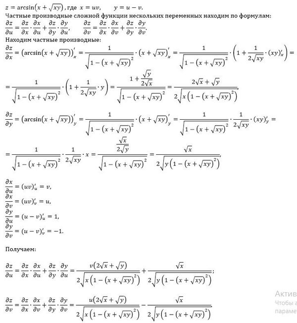 Найти dz/du, dz/dv, если z =arcsin(x+√xy) , где x= uv, y =u-v