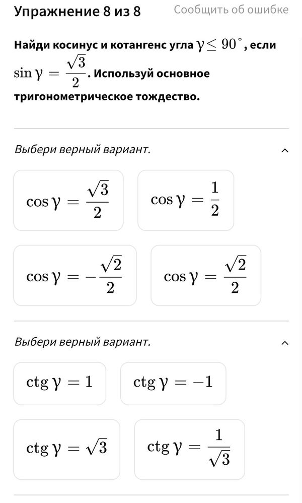 Найди косинус и котангенс угла Y, если Y ≤ 90° и sinY = √3/2. Используй основное тригонометрическое тождество.