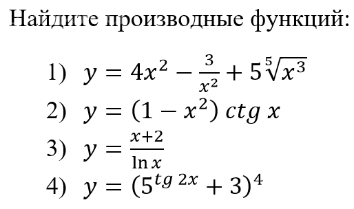 Найдите производные функции: 1) y = 4x^2 - 3/x^2 + 5√x^3 2) y = (1 - x^2) ctg x 3) y = (x+2)/ln x 4) y = (5^(tg 2x) + 3)^4