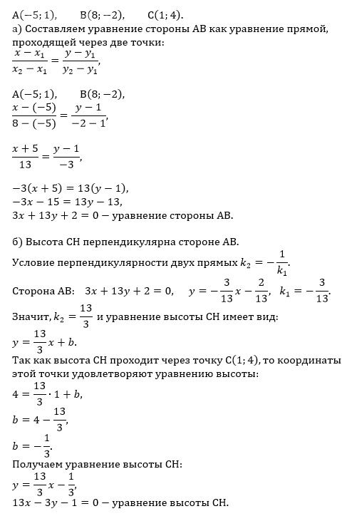Даны вершины треугольника ABC. Найти: а) уравнение стороны AB; б) уравнение высоты CH; в) уравнение медианы AM; г) точку персечения медианы AM и высоты CH; д) уравнение прямой, проходящей через вершину C параллельно стороне AB; е) расстояние от точки C до прямой AB
