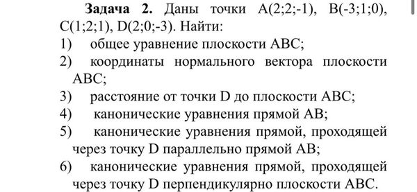 Задача 2. Даны точки А(2;2;-1), В(-3;1;0), ! С(1;2;1), D(2;0;-3). Найти: 1) — общее уравнение плоскости АВС; 2) координаты нормального вектора плоскости АВС; 3) — расстояние от точки Р до плоскости АВС; 4) — канонические уравнения прямой АВ; 5) — канонические уравнения прямой, проходящей через точку Э) параллельно прямой АВ; 6) канонические уравнения прямой, проходящей через точку О перпендикулярно плоскости АВС.