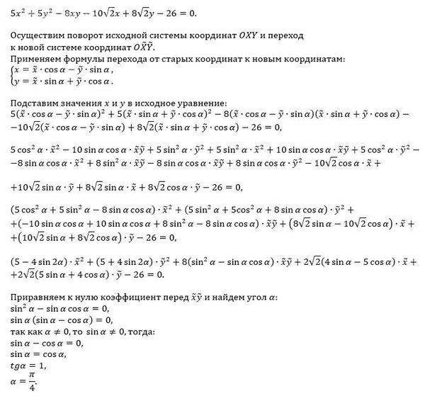 привести кривую второго порядка к каноническому виду, сделать чертёж в канонической системе координат 5x² + 5y² - 8xy - 10√2x + 8√2y - 26 = 0