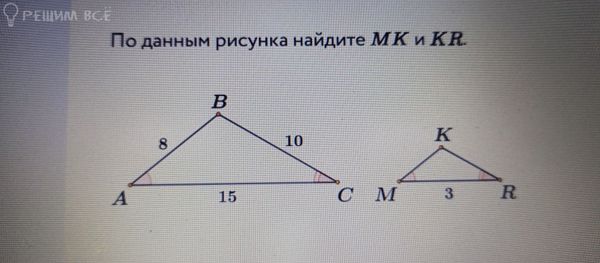 ABC и MKR - подобные треугольники, их углы равны, а стороны пропорциональны друг другу. Коэффициент подобия k = AC/MR = 15/3 = 5 AB/MK = 8/MK = k = 5; MK = 8/5 = 1,6 BC/KR = 10/KR = k = 5; KR = 10/5 = 2 Ответ: MK = 1,6; KR = 2