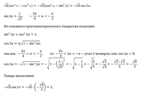 Найти знач выражения √6(sin^2α-cos^2α) если sin2α=1/√3, α принадлежит (-3п/4,-п/2), найти cos2α
