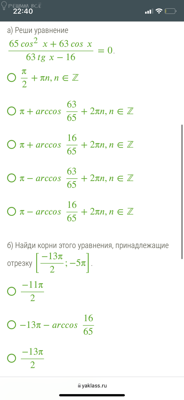 a) Реши уравнение (65 cos^2 x + 63 cos x) / (63 tg x - 16) = 0. б) Найди корни этого уравнения, принадлежащие отрезку [-13π/2 ; -5π].