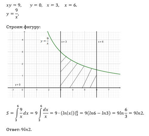 вычислить площадь фигуры ограниченной гиперболой xy=9 осью Ох и прямыми х=3 и х=6