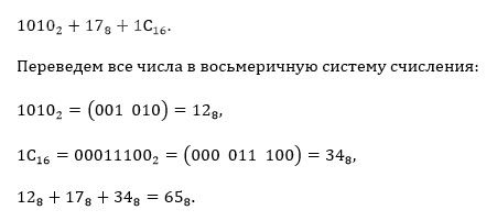 найдите значение выражения: 1010_(2)+17_(8)+1С_(16). Ответ запишите в восьмеричной системе счисления