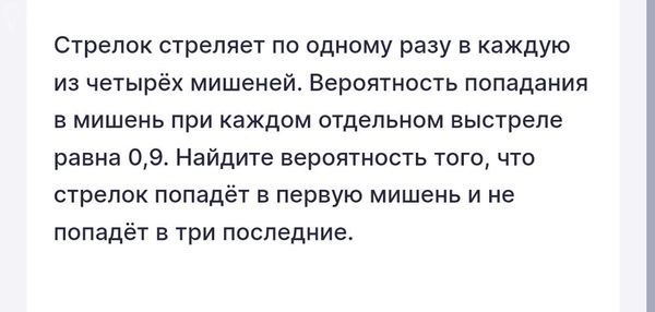Стрелок стреляет по одному разу в каждую из четырёх мишеней. Вероятность попадания в мишень при каждом отдельном выстреле равна 0,9. Найдите вероятность того, что стрелок попадёт в первую мишень и не попадёт в три последние.