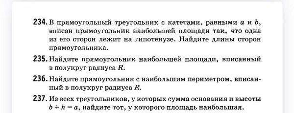 Номер 235. Найдите прямоугольник наибольшей площади, вписанный в полукруг радиуса R.