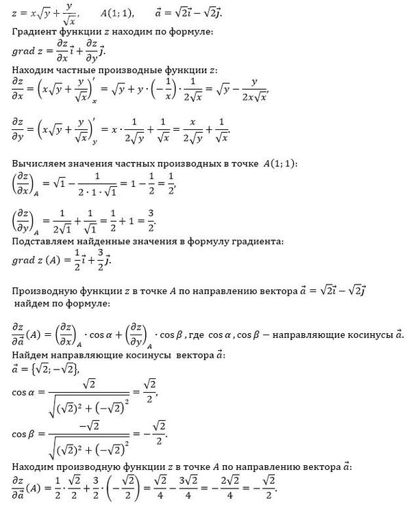 Найти grad z в точке А и производную функции z(x,y) в точке А по направлению вектора а.