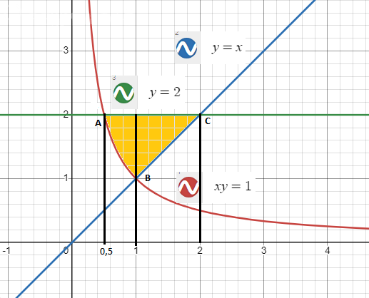 [m]S_1 = \int \limits_{1/2}^1 (2 - \frac{1}{x})dx = 2x - \ln |x| |_{1/2}^1 = (2 \cdot 1 - \ln 1) - (2 \cdot \frac{1}{2} - \ln \frac{1}{2}) =[/m]