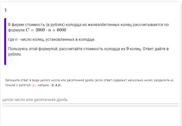 В фирме стоимость (в рублях) колодца из железобетонных колец рассчитывается по формуле С = 3900 - n + 6000 Где n - число колец, установленных в колодце. Пользуясь этой формулой, рассчитайте стоимость колодца из 9 колец. Ответ дайте в рублях.