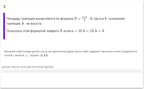 Площадь трапеции вычисляется по формуле S = (a+b) / 2 * h, где a и b - основания трапеции, h - ее высота. Пользуясь этой формулой, найдите S, если a = 15, b = 13, h = 3.
