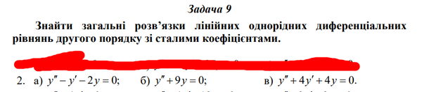 Задача 9 Знайти загальнш розв’язки лнйних однордних диференщальних р!внянь другого порядку с сталими коефищентами.