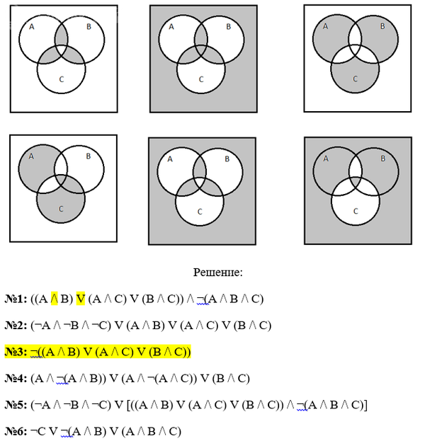 Дальше идут те же 3 скобки (A /\ B) \/ (A /\ C) \/ (B /\ C), которые описывают закрашенные области, где пересекаются пары кругов, и в том числе все три круга.