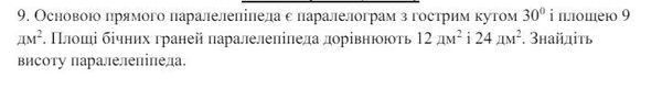 9. Основой прямого параллелепипеда является параллелограмм с острым углом 30° и площадью 9 дм². Площади боковых граней параллелепипеда равны 12 дм² и 24 дм². Найдите высоту параллелепипеда.