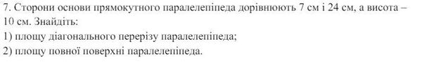 7. Стороны основания прямоугольного параллелепипеда равны 7 см и 24 см, а высота