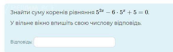 5^(x)=t, t^(2)-6t+5=0, t_(1)=1, t_(2)=5, 5^(x)=1, x=0; 5^(x)=5, x=1. Сумма корней: 0+1=1. Ответ: 1.