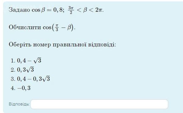 cos((π/3)- β )=cos(π/3)*cos β +sin(π/3)*sin β=