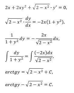 Найдите общий интеграл дифференциального уравнения (Ответ выразите в виде . ψ(x, y) = C): 2x + 2x * y ^ 2 + √(2 - x ^ 2) * y' = 0