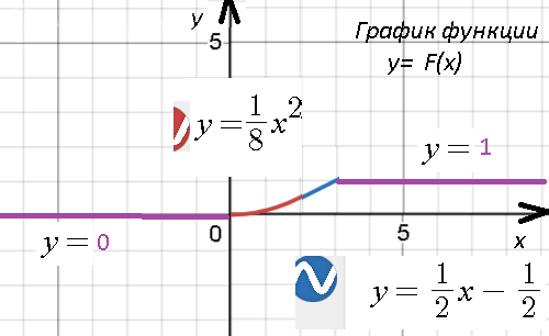 [m]F(x)\left\{\begin {matrix}0, x ≤0\\\frac{1}{8}x^2,0<x≤2\\\frac{1}{2}x-\frac{1}{2}, 2<x ≤ 3\\1, x > 3\end {matrix}\right.[/m]