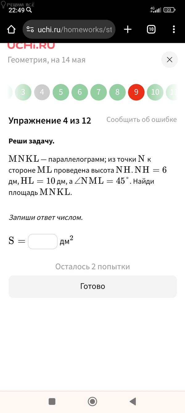 MH=NH=6 ( ∠ NMH=45 ° - треугольник прямоугольный равнобедренный )