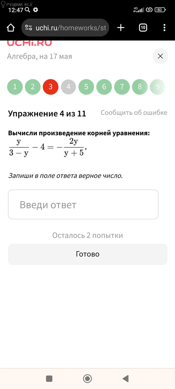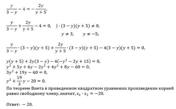 Вычисли произведение корней уравнения: ???? 3 − ???? − 4 = − 2 ???? ???? + 5 3−y y −4=− y+5 2y .