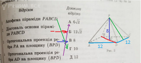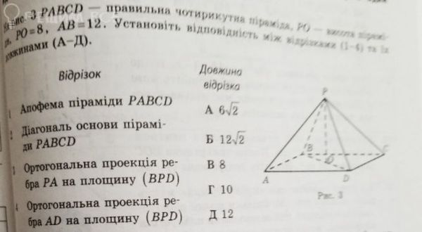 PABCD — правильна чотирикутна піраміда, РО - висота піраміди. PO=8. АВ=12. Установіть відповідність між відрізками (1-4) та їх довжинами (А-Д) 1. Апофема піраміди РАВСD 2. Діагональ основи піраміди PABCD 3. Ортогональна проекція ребра РА на площину (BPD) 4. Ортогональна проекція ребра АД на площину (BPD) А. 6√2 Б. 12√2 B. 8 Γ. 10 Д.12
