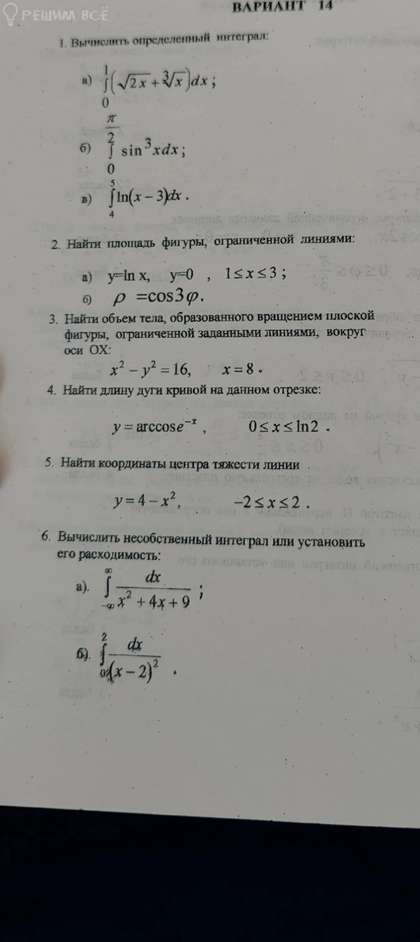 6) а) [m]\int \limits_{-\infty}^{+\infty} \frac{dx}{x^2+4x+9} = \int \limits_{-\infty}^{+\infty} \frac{dx}{x^2+4x+4+5} = \int \limits_{-\infty}^{+\infty} \frac{dx}{(x+2)^2+5} =\frac{1}{\sqrt{5}} arctg \frac{x+2}{\sqrt{5}}\ |_{-\infty}^{+\infty}[/m]