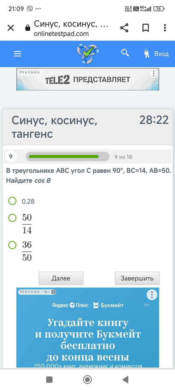 cos B= BC/AB=14/50=0.28 БИНГО Удачи)