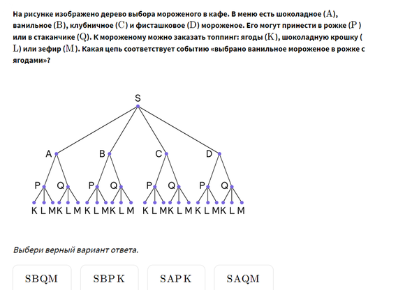 Так как в задании цепь соответствует событию «выбрано ванильное мороженое в рожке с ягодами», правильным вариантом ответа является SBPK.