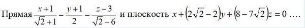 Проверим расположение направляющего вектора прямой [m](\sqrt{2}+1; 2; \sqrt{2}-6)[/m] и нормального вектора плоскости [m](1; 2\sqrt{2}-2; 8-7\sqrt{2})[/m]