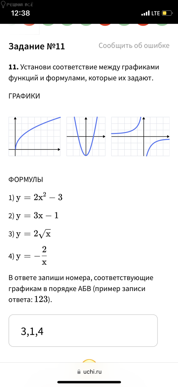 (VAT „«! ТЕ Задание №11 11. Установи соответствие между графиками функций и формулами, которые их задают. ГРАФИКИ ФОРМУЛЫ 1)у = 2х? — 3 2)у = 3х — 1 3y = 2v/x 2 4y = —— X В ответе запиши номера, соответствующие графикам в порядке АБВ (пример записи ответа: 123). 3,1,4 £ @ uchi.ru К