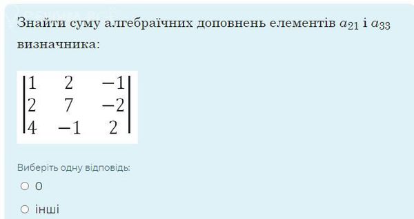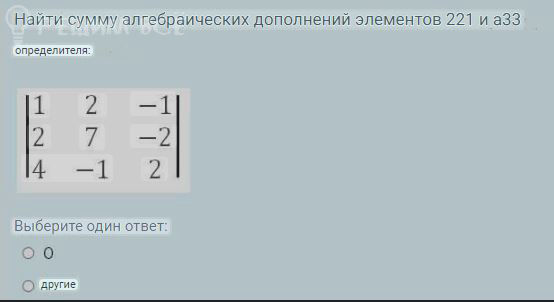 А_(21)=(-1)^(2+1)* |2 -1| |-1 2|=-1*(2*2-(-1)*(-1))=-(4-1)=-3, A_(33)=(-1)^(3+3)* |1 2| |2 7|=1*(1*7-2*2)=3 A_(21)+A_(33)=-3+3=0