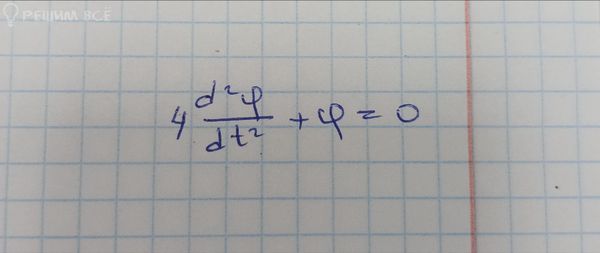 4φ'' + φ = 0 φ'' + φ/4 = 0 Линейное однородное дифференциальное уравнение 2 порядка. Характеристическое уравнение: k^2 + 1/4 = 0 k^2 = -1/4 k1 = -0,5*i; k2 = 0,5*i Решение уравнения: φ(t) = C1*cos 0,5t + C2*sin 0,5t