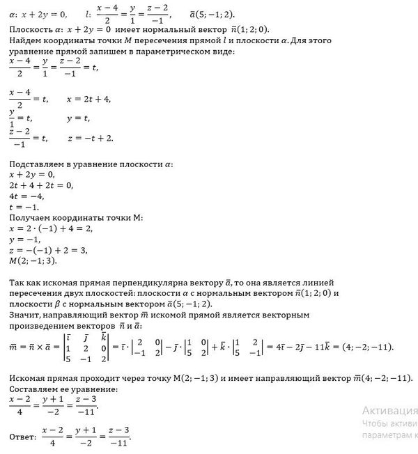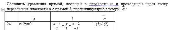 Составить уравнения прямой, лежащей в плоскости альфа и проходящей через точку пересечения плоскости альфа с прямой ℓ, перпендикулярно вектору а :