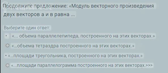 Модуль векторного произведения двух векторов равен площади параллелограмма, построенного на этих векторах.