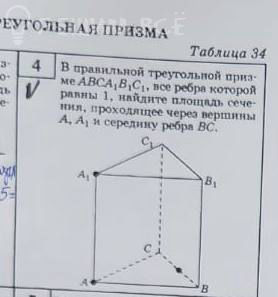 в правильной треугольной призме ABCA1B1C1, все ребра которой равны 1, найдите площадь сечения, проходящее через вершины A, A1 и середину ребра BC