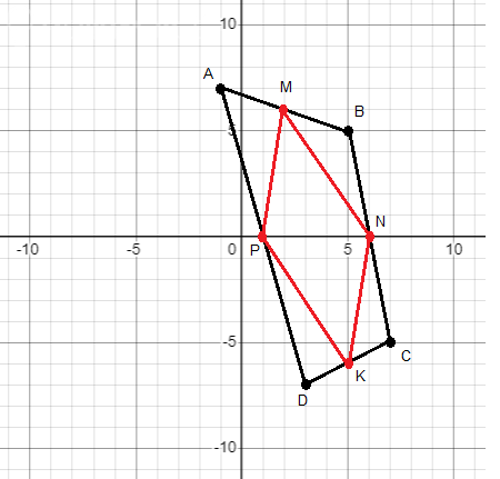 Найдем середины сторон: M = (AB)/2, N = (BC)/2, K = (CD), P = (DA)/2