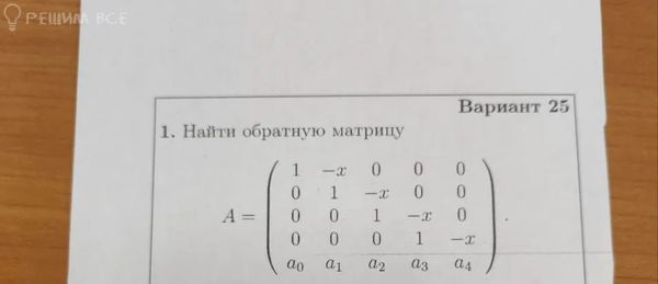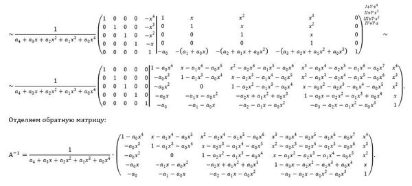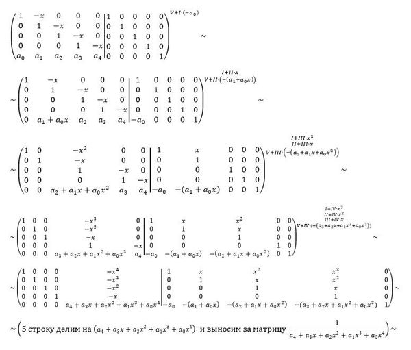 Найти обратную матрицу A = [ 1 -x 0 0 0 ] [ 0 1 -x 0 0 ] [ 0 0 1 -x 0 ] [ 0 0 0 1 -x] [ a0 a1 a2 a3 a4]