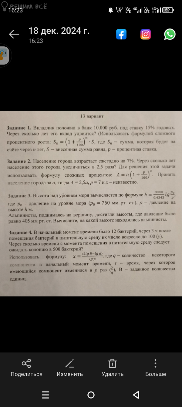 [b]№ 3[/b] h=(8000/0.4343)lg(760/425) ≈ 18420,5*0,27 ≈ 49735,5. [b]№ 4[/b] x=(3*(lg500-lg12))/lg(100/12) ≈ (3*(2,7-1,1))/0,9 ≈ 5,3.