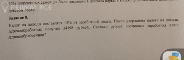 1) 100-13=87 (%) - от заработной платы получил рабочий. 2) 34198:0,87 ≈ 39308 (рублей) - заработная плата рабочего. Ответ: 39308 рублей.
