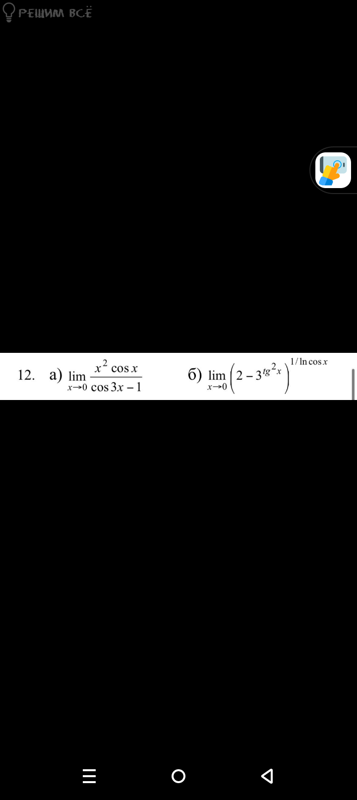[m]\lim \limits_{x \to 0} \frac{x^2 \cos x}{\cos 3x - 1} = \lim \limits_{x \to 0} \frac{2x \cos x + x^2(-\sin x)}{-3\sin 3x} = -\lim \limits_{x \to 0} \frac{2x \cos x - x^2 \sin x}{3\sin 3x} = \frac{0+0}{0}[/m]